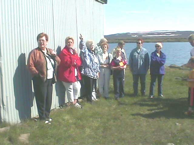 Frá þessari frásögn var ekið áfram fyrir nesið og inn í Vatnsfjörðinn þar sem Þorvaldur Vatnsfirðingur sat og ekki alltaf á friðarstóli. Þar heimsóttum við Baldur Vilhjálmsson, prest, sem hefur fengið því framgengt að kirkjustaðurinn hefur verið gerður glæsilega upp. Kirkjugarðurinn er hringlaga og uppbyggður og kirkjan sjálf hefur fengið verulega andlitslyftingu. Þetta er glæsilegur staður heim að sækja. Við vorum svo lánsöm að Baldur tók á móti okkur og leiddi okkur um staðinn. Hann sagði af staðnum og kirkjunni og dró fram marga þætti bæði fróðlega og skemmtilega. Frá Vatnsfjarðarstað var ekið að stórbýlinu Þúfum þar sem Elín Guðmundsdóttir ólst upp frá 6 til 25 ára og þar sem þau giftu sig hún og Arnfinnur inni í hinum glæstu, samliggjandi stofum - eins og þau sögðu okkur frá. Presturinn sá lifir enn og er liðlega 100 ára og verður ekki annað sagt en að það prestsverk hans reyndist endingargott. Hitinn var mikill og við drógum okkur niður í hvamm við ána - og snæddum nesti í hitapotti móti sólu. Síðan ókum við að Miðhúsum þar sem Sumarliði fæddist. Ekki vitum við svo gjörla hvort foreldrar hans bjuggu þá þegar í Seli eða voru að fara þangað til ábúðar en þangað fóru þau með Sumarliða þegar hann var þriggja vikna. Sjálfsagt hefur sá spölur verið ekki minna en tveggja tíma gangur í góðu veðri. Klukkan var liðlega 16 þegar við vorum aftur komin í Reykjanes. Þeir sem þar höfðu dvalið höfðu hvílt sig í sólbaði og sundlauginni og voru sannarlega sólsælir. |