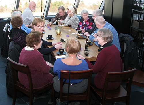 Í Perlunni 5. febrúar 2020 Unnur, Solveig, Kristín, Anna Björg og Sigurlaug og Kristján hlýða á tölu Guðmundar Garðars. |