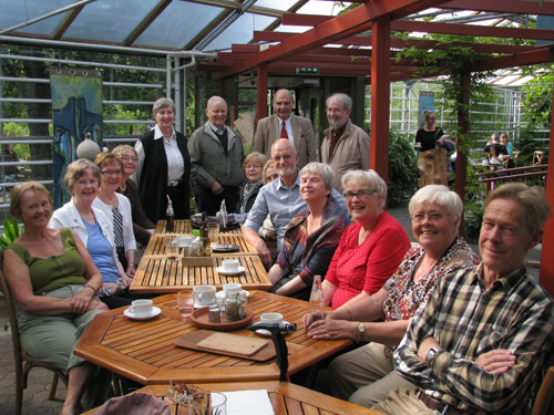 ![]() - í frábæru veðri í Flóru í Grasagarðinum í Laugardal - Réttsælis frá Hildi Bjarnadóttur sem er óþekkjanleg á myndinni í himinblámanum á bak við Hauk Filippusson, sem henni er næstur, og svo þau Kristín Arnalds, Albína Thordar sem horfir frá okkur, Björk Jónsdóttir, Andrés Svanbjörns, Guðmundur G. Þórarins, Ragnheiður Ben og Elsa Rúna Antonsdóttir. Meðal umræðuefna var bókmenntalegt innlegg greinar sem