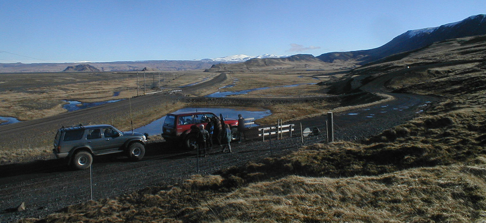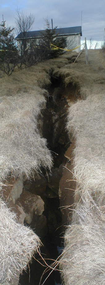 Nærri Skeiðavegamótum á heimleiðinni litum við á stóru jarðsprunguna sem myndaðist á magnþrungnu sekúndunum þann 17. júní árið 2000. |