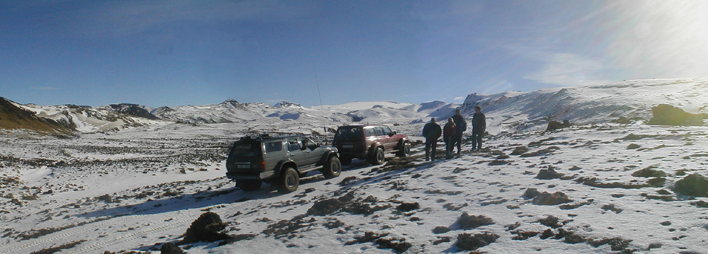 | Upp í snjó | Veðrið var aldeilis yndislegt og við ókum upp brattan slóðann en senn var komið þar sem snjór var nokkur á jörðu. |