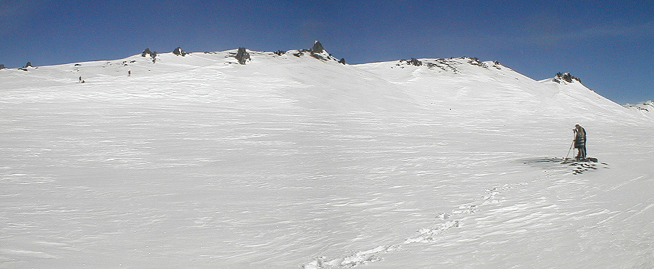 | Bjart á jökul | Klukkan 8 var úr rekkju risið og jökullinn skartaði sínum bjarta skalla og ákveðið var að fara upp þótt veðurspár gætu auðvitað haft rétt fyrir sér og þá kæmi skýjahettan á okkur á uppleiðinni. Við runnum vestur að afleggjaranum upp á Hamragarðaheiðina skammt vestan við Stóradal. |