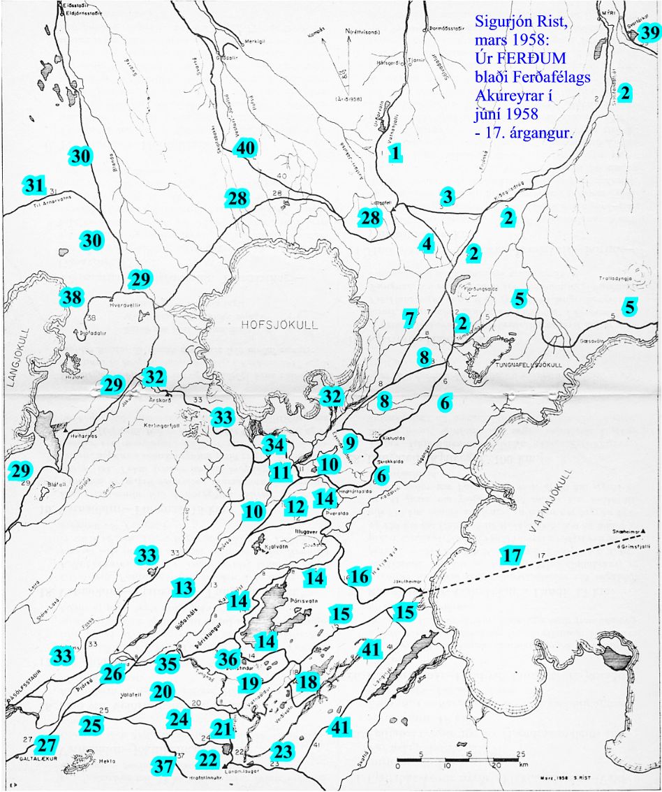 Öræfaleiðir haustið 1957© fjölsk. Sigurjóns Rist Meðfylgjandi kort er úr Ferðum, blaði Ferðafélags Akureyrar, 17. árgangi í Júni 1958. Blaðið flytur greinina Öræfaleiðir eftir Sigurjón Rist. Á teikningunni eru númer sem vísa til skýringa sem fylgdu með í blaðinu. Skýringar Sigurjóns fylgja hér með. Inn er skotið auðkenndum athugasemdum þar sem við á - en nokkur breyting hefur orðið á sumum leiðum á þeirri senn hálfu öld sem liðin er frá því að Sigurjón tók þetta saman. |