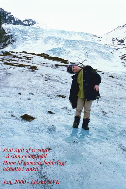 Frá Hvolsvelli tók Klemens að sér öryggissætið og rak lestina - sem senn var öll hjá Jökulsá. Ísar höfðu hjaðnað á Lóninu og lygnurnar við upptök árinnar spegluðu jökulinn og Skoltana. Við dokuðum stundarkorn og börn að árum og önnur í anda runnu yfir ísinn upp að jöklinum sem skreppur í sífellu stórlega saman. |