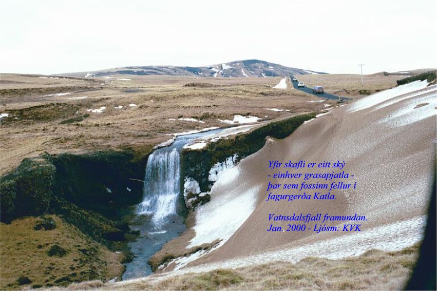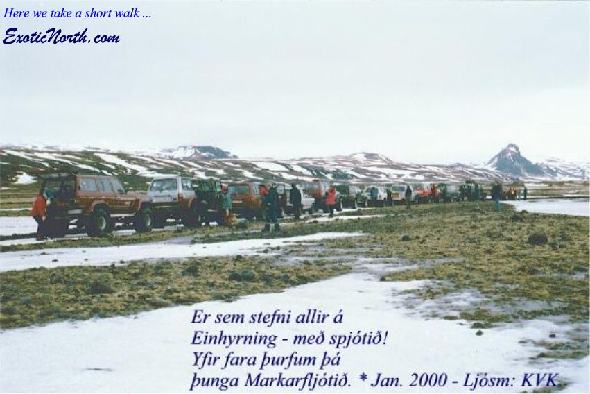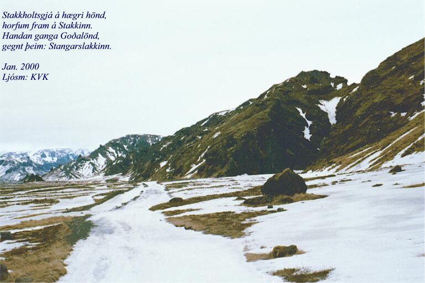 Pétur Örn leiddi okkur inn með Stakkholtinu, framhjá Stakkholtsgjá, yfir Hvanná, hjá Álfakirkjunni og fram að Krossá. Hún var með blíðu móti svo sem tilheyrir á vetri þegar hvergi er krap. Umhverfis voru þó mikil ísaþök og ljóst að hér hafði verið harður vetur fyrir skömmu. Í Skagfjörðsskála tókum við upp farangur og komum okkur fyrir, snæddum - og héldum svo aftur af stað fram yfir Krossá. |