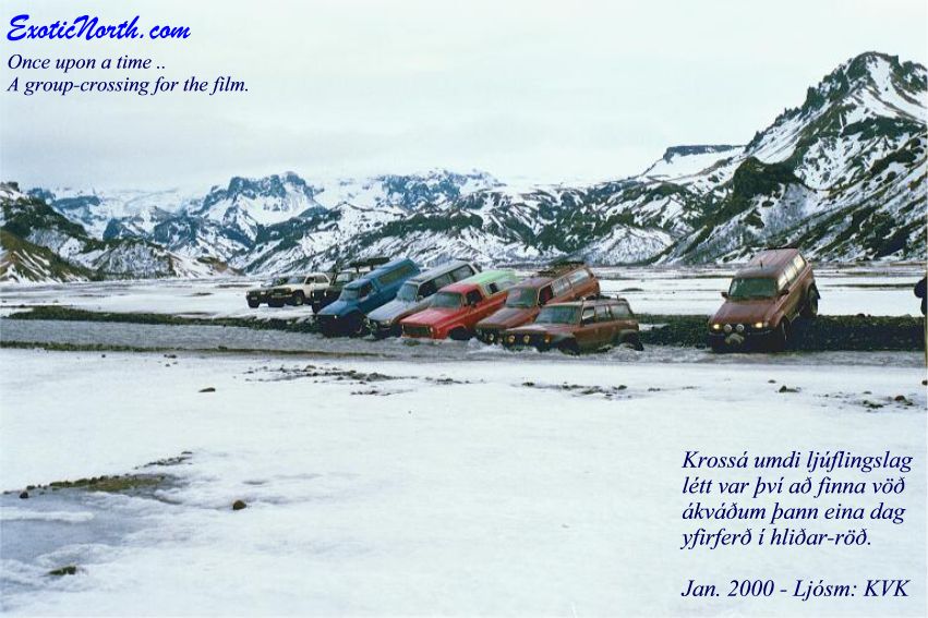 Nú héldum við áfram inn eyrarnar sem Krossá krossar. Það var auðvitað að við þurftum að fara hana fram og aftur og hér voru vetrartökin harðari og hjarn og ísar stundum nokkuð til skemmtunar. Ingi var að venju fundvís á góðar leiðir og klukkan 17 vorum við hjá Búðarhamri. Hvergi sáum við raunar höld þau hin miklu sem fornar sögur segja þar vera til að binda við þau hafskip sem þá gengu hingað upp árnar. Ekki urðum við heldur vör við vættir þær hinar römmu sem hrellt hafa næturgesti á þessum slóðum. |