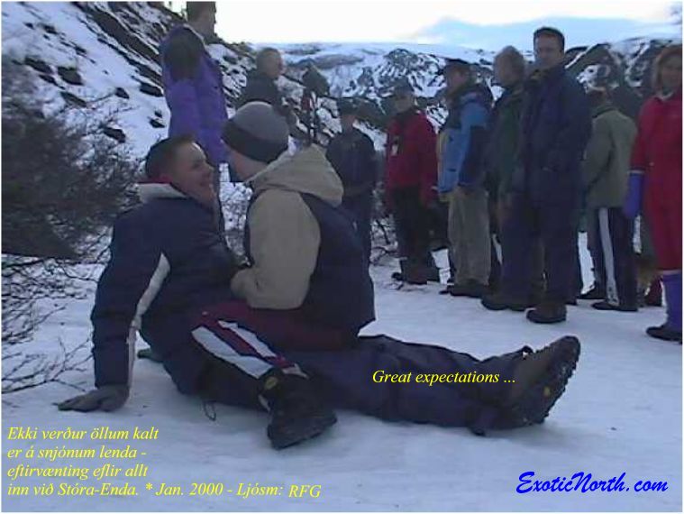 Við ókum upp að tóft gamla leitarmannahússins á Hellisvöllum og tókum myndir af mannskapnum. Börnin voru í brekkum og giljum og hellum og þegar hópurinn lagði af stað voru ritari og Pétur eftir því börnin höfðu horfið upp gilið og voru í brasi í efstu fönnum. Við gengum eftir þeim - og öll komum við aftur að mestu heil á húfi og Arna var furðufljót að gera við höndina á sér. Niður með Þórólfsfellinu fylgdum við svellalögum Gilsár og ókum yfir hana nærri varnargarðinum við Fellið. Þórólfsá var einnig kyrr og hljóð í rennu milli höfuðísa og þar fórum við án fyrirstöðu upp á Fljótshlíðarveginn. |