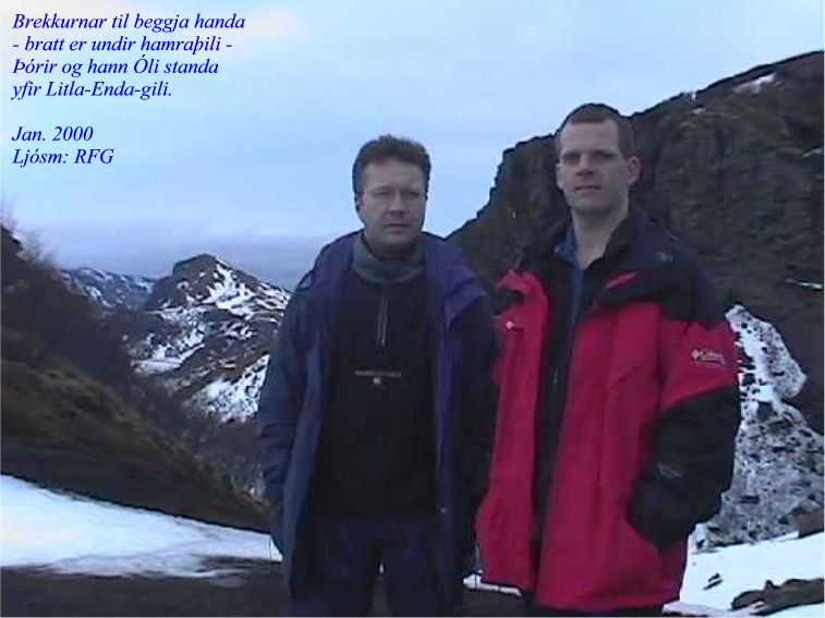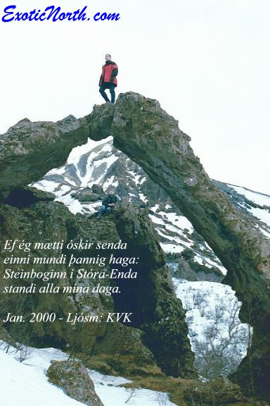 Matti og Ingi leiddu okkur inn aurana og yfir Krossá móts við Endana. Í Stóra-Enda gengum við upp með læknum og síðan í sveig til vesturs að Steinboganum mikla og fræga. Nú er hann mörgum lítt kunnur þar sem alfaraleiðir eru ekki svo mjög á þessar slóðir. Við horfðum niður Litla-Enda-gilið með sitt glæsta sjónarhorn á Valahnúk.