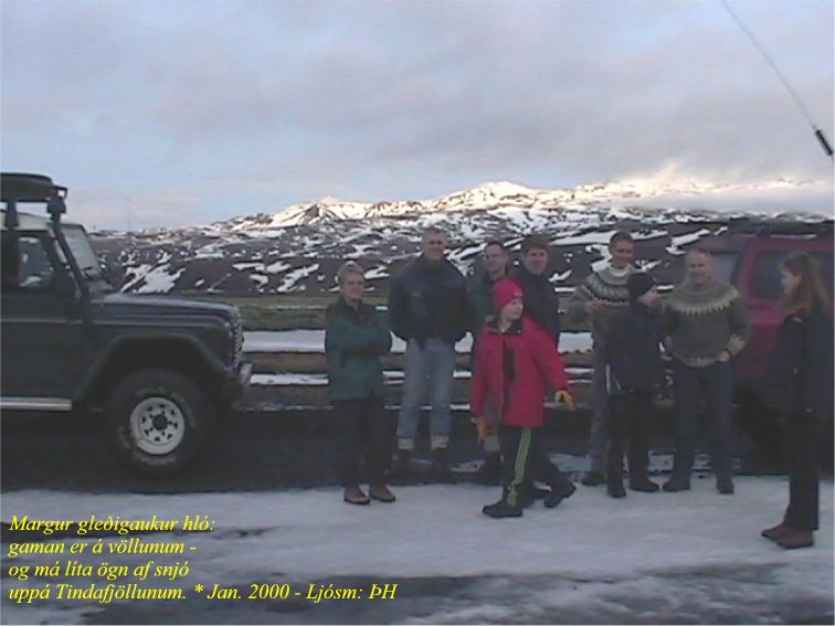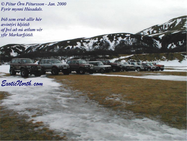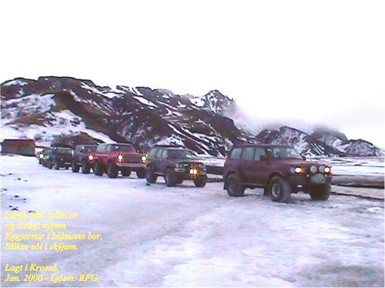 Klukkan var farin að ganga 17 og hér kvöddumst við og hver hélt til síns heima eftir fjölbreytta og frábæra ferð. Í fyrstu höfðum við haldið að þetta yrði sumarferð að vetri. Þegar til kom reyndist vetur konungur öflugri inn milli jöklanna og leiðir okkar voru lagðar um meginvötn héraðsins. Vetrarferðin 2000 í Þórsmörk stendur því mjög vel undir nafni. |