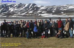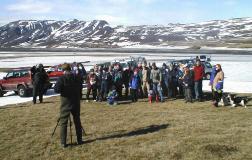 Nú ókum við sólbjartar eyrarnar og um ísa og fannir og inn á Hellisvellina inni í hamravirkinu gríðarlega. Við gleyptum í okkur dálítinn bita, tókum myndir af hópnum í glaðabjörtu sólskininu og logni þessa indæla staðar. |